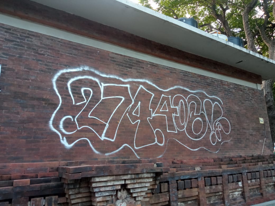 Aksi tersebut terekam kamera CCTV pada Sabtu (20/9), dengan coretan berbentuk kode angka, seperti “400” pada dinding salah satu coffee shop dan “.274.408”pada tembok berbata merah.