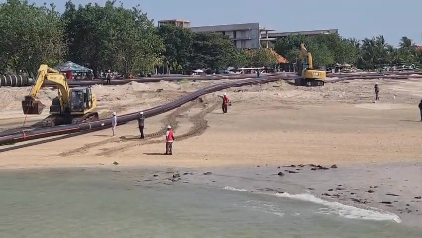 Sebagai bagian dari persiapan, tim proyek kini tengah memasang pipa baja (steel pipe) di area daratan (onshore) yang akan digunakan sebagai jalur distribusi pasir. Pipa tersebut dipasang membentang dari Pantai Sekeh hingga kawasan Pantai Hotel Anvaya dengan panjang sekitar 1 kilometer.