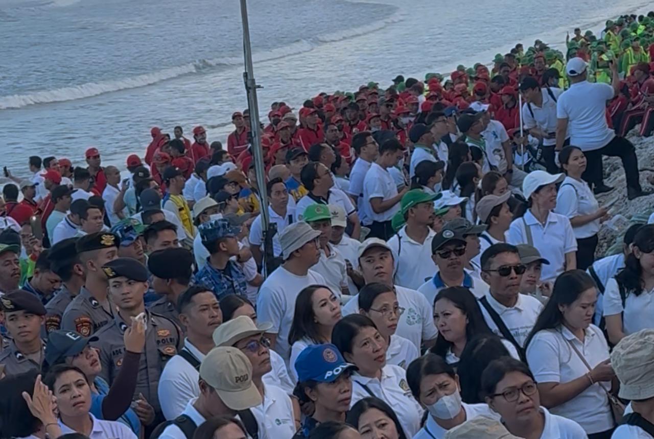 Sekitar 10 ribu masyarakat dari berbagai elemen memenuhi kawasan Tsunami Shelter Pantai Kuta pada Kamis (5/6). Mereka melakukan aksi bersih pantai dalam rangka puncak peringatan Hari Lingkungan Hidup Sedunia 2025.