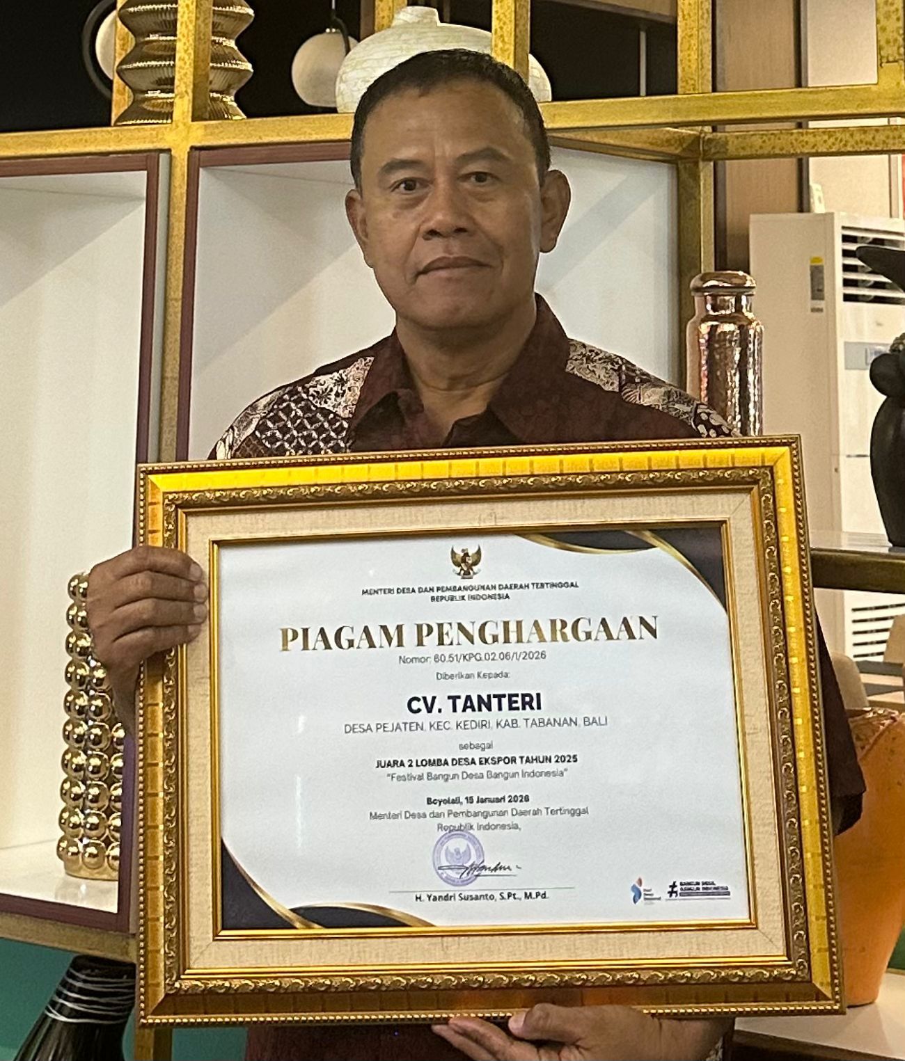 Kabupaten Tabanan kembali menorehkan prestasi di tingkat nasional. CV Tanteri yang berlokasi di Desa Pejaten, Kecamatan Kediri, berhasil meraih juara II Lomba Desa Ekspor Tahun 2025.